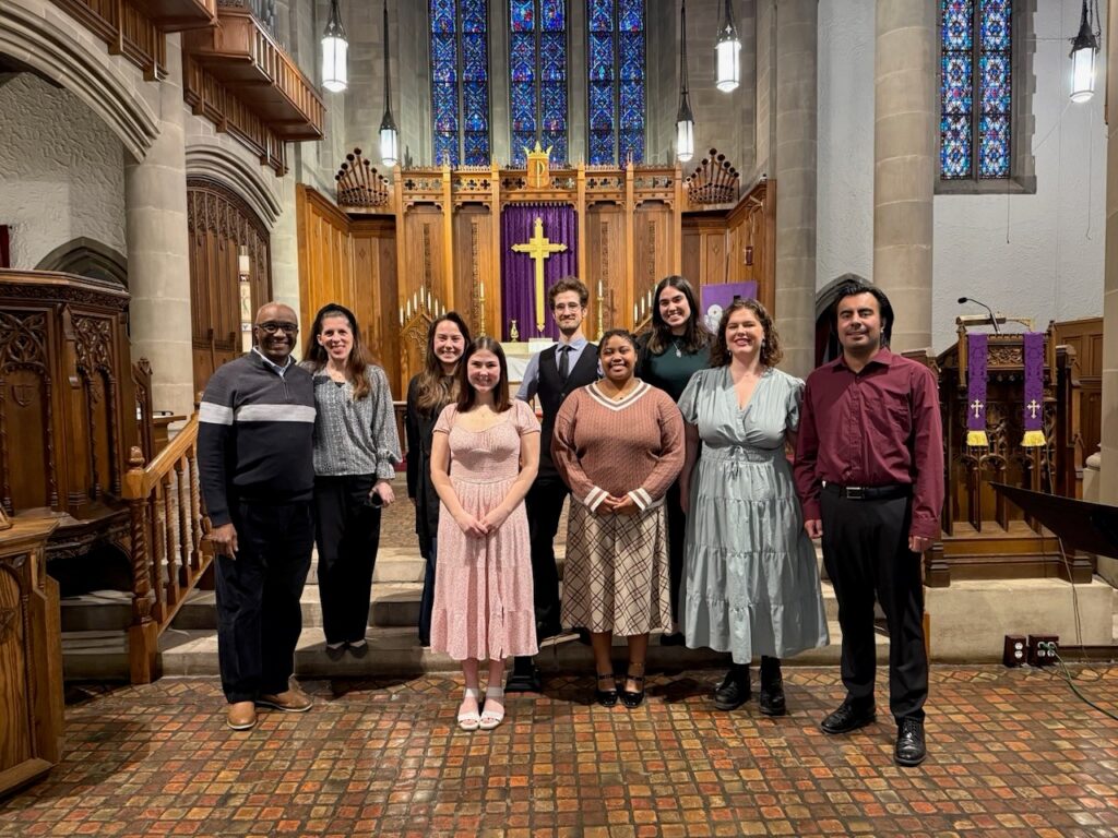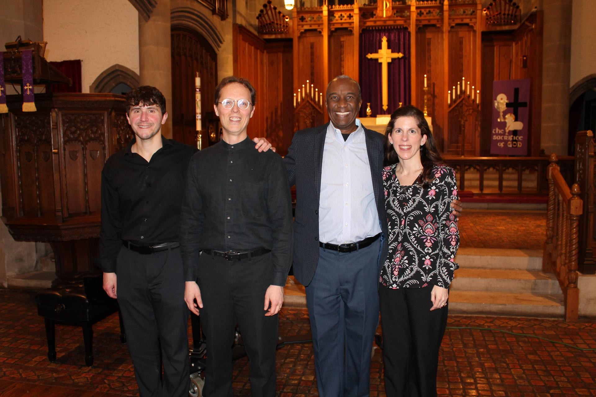 Cellist Trevor Kazarian, pianist Dr. Thomas Bandy, baritone Dr. Emery Stephens, and Music Director Dr. Abigail Haake celebrate the completion of a magnificent concert . The program featured numerous works by African American poets and composers